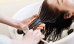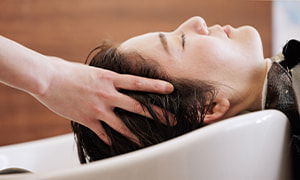 地肌マッサージ方法『頭筋リリース』の手法を用いて、血行促進し、地肌に栄養を行き届頭皮をほぐしながら